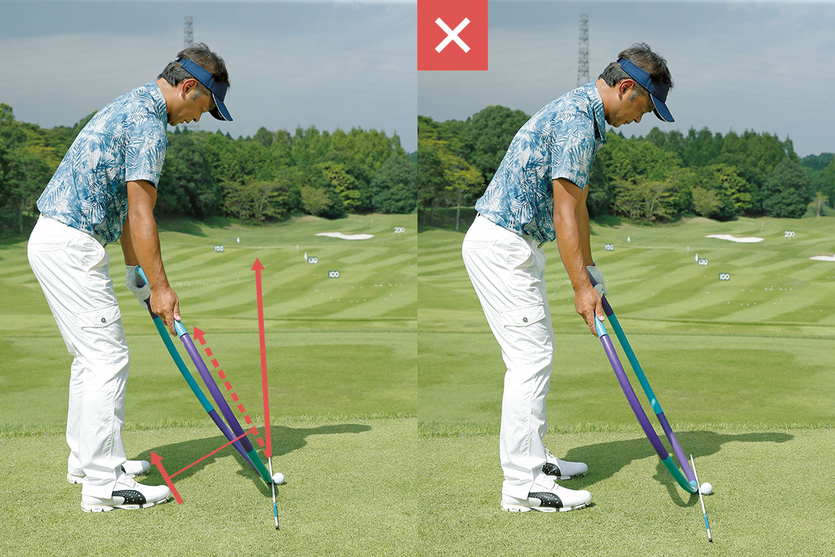 ダウンブローで目標に対してまっすぐ打つための説明をしましょう。クラブパスが2度くらい右向きで、クラブパスに対してフェースがまっすぐだとボールが1.5~2度右に飛び出すわけですから、クラブパスが目標に対してまっすぐの0度になるように構えるのです。つまり、体全体を左に2度向ければ、クラブパスもフェースアングルもターゲットに対してまっすぐになります。