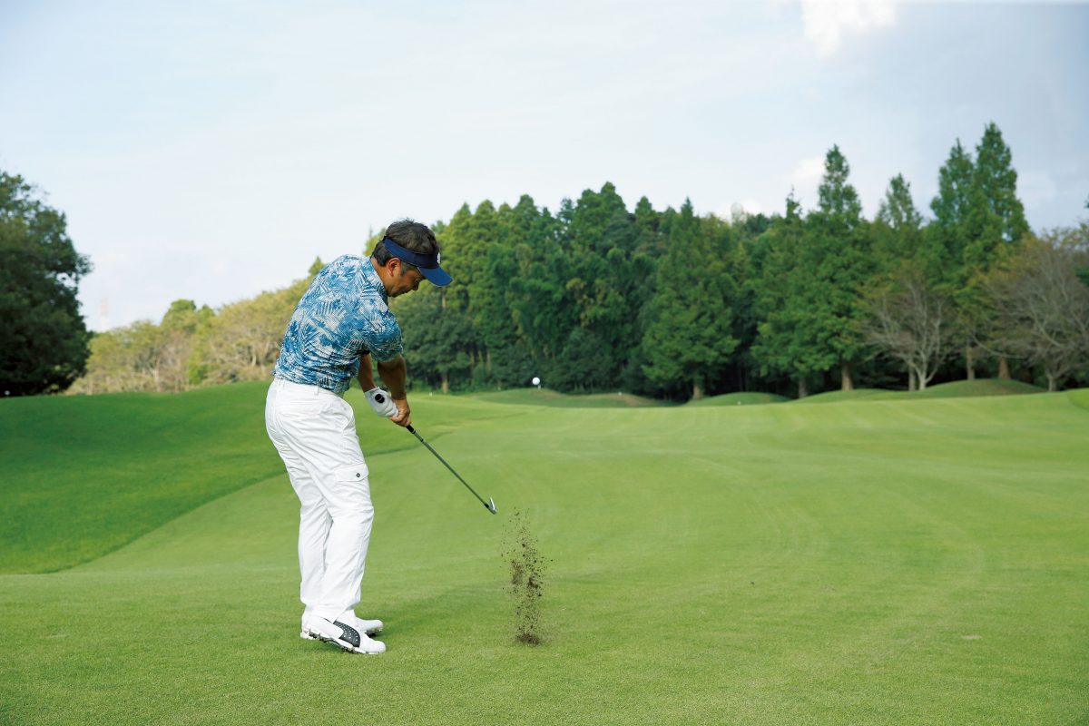 クラブヘッドはスイング軌道の最下点に到達するまではインサイドから下りてきて、最下点を境にしてインサイドへと振り抜かれます。つまり、最下点に達する手前でボールをとらえるダウンブローの軌道は、インサイドアウトになるわけです。