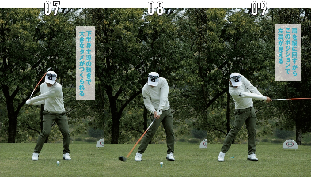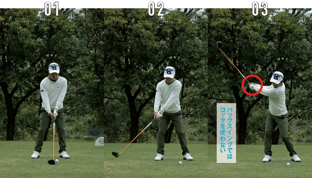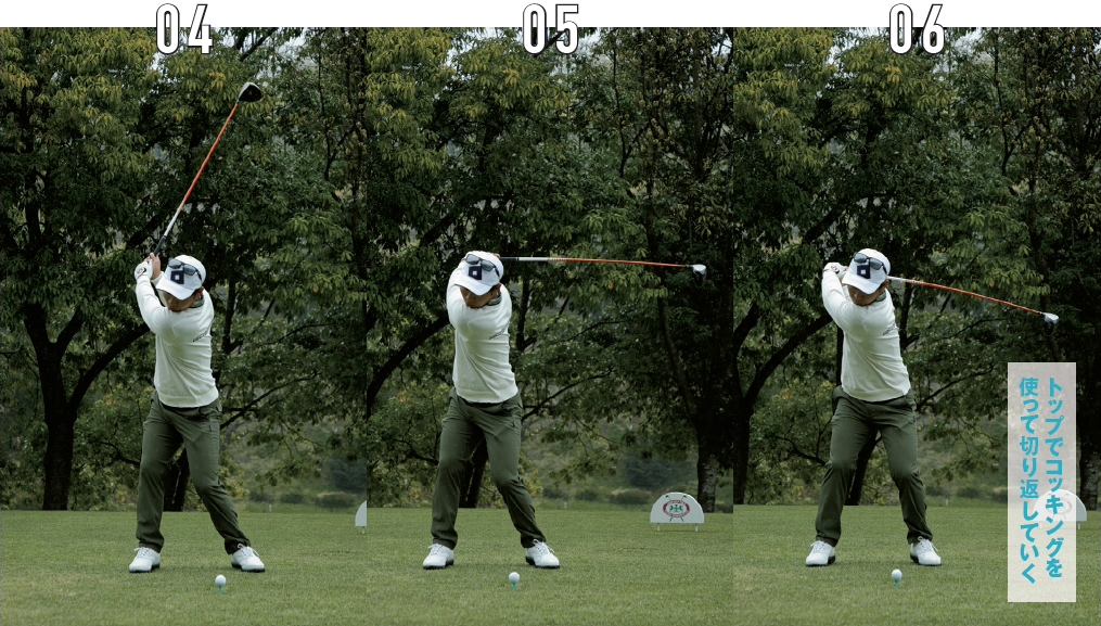 バックスイングで手首を固定しているといっても、ガチガチに固めているわけではありません。トップに近い位置で手首をコックし、ダウンスイングでも手首の角度をキープしてインパクトで一気にリリースするのです。要はテコの原理の応用で、パワー不足を補うための工夫といえます。