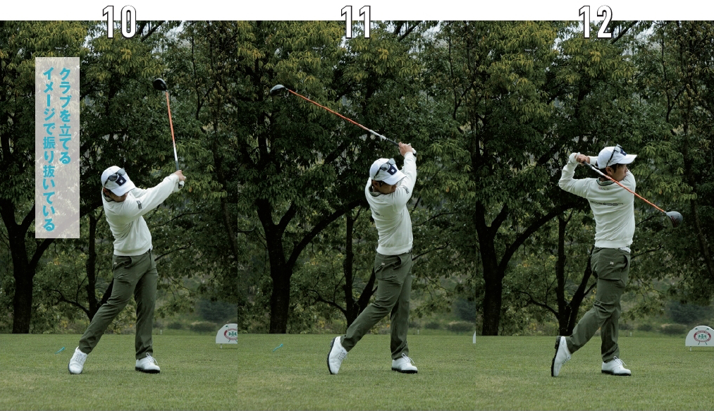 左足の踏み込みが強いから大きなタメがつくられるのですが、釣り人が釣り糸を遠くまで投げるキャスティングの要領でリストをうまく使っている点にも着目してください。