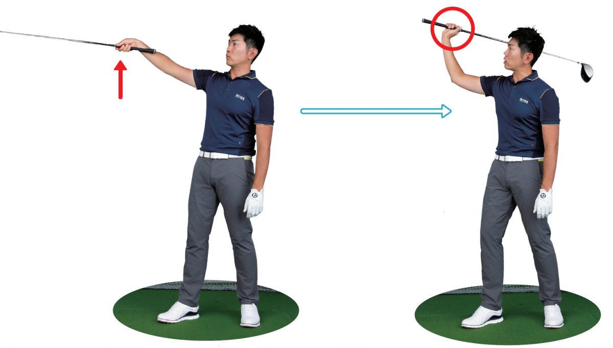 テコの原理でスイングしやすくするために、肩を縦に近い角度で回転するのも大切なポイントです。