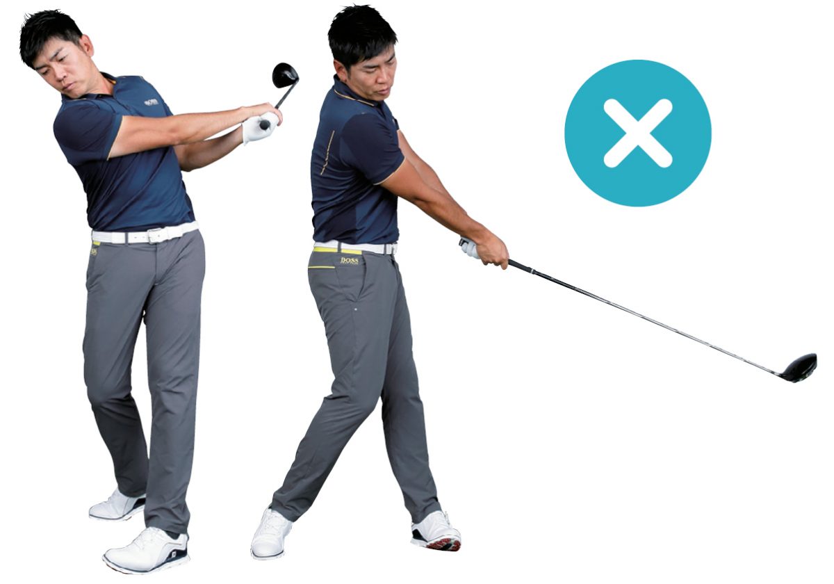 【×】肩を横に回そうとすると腰が引けてしまい、様々なミスショット招く。また、肩が横回転になっている人は上体が早く開くため、正面から左肩が見えない