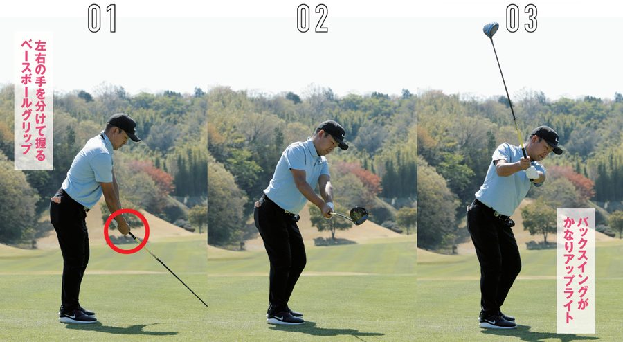 左手の親指もグリップから外し、野球のバットを持つようなベースボールグリップで握っている。
