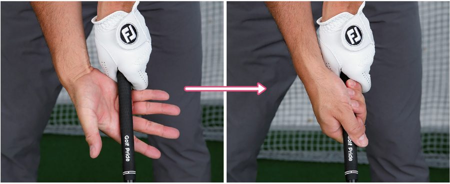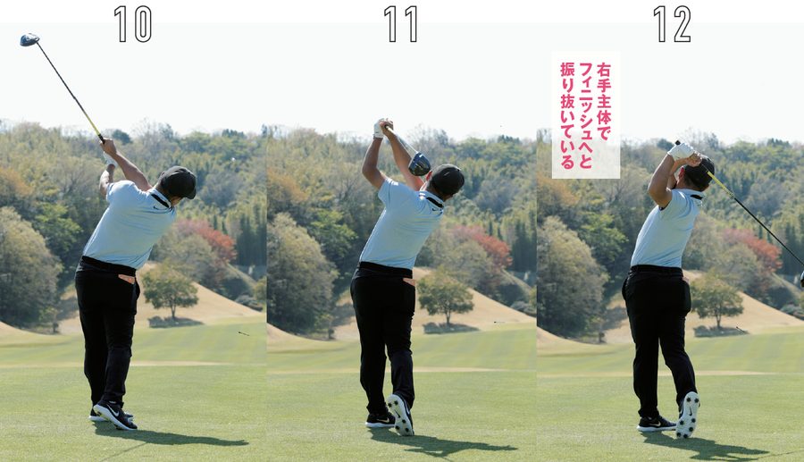 【右】左手も深くかぶせて握るかなりのフックグリップだ