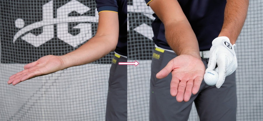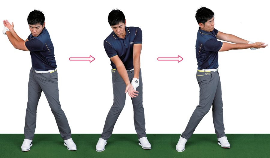 右手のひらを上に向けて振ればフェースがスクエアに保たれる。右手のひらの向きをキープしよう。