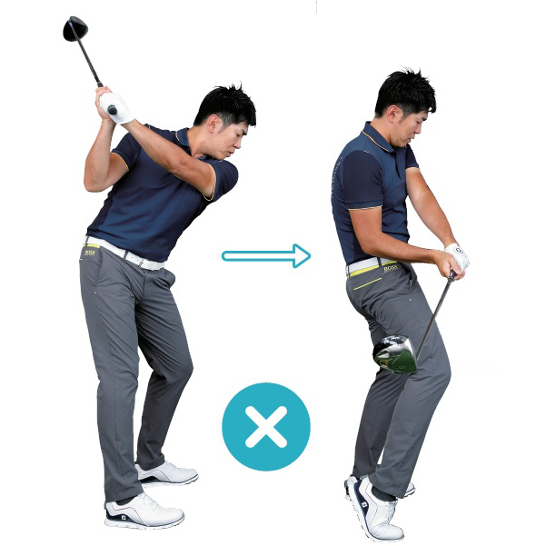 【×】ダウンスイングで右ヒザが前に出ると上体が起き上がってしまう