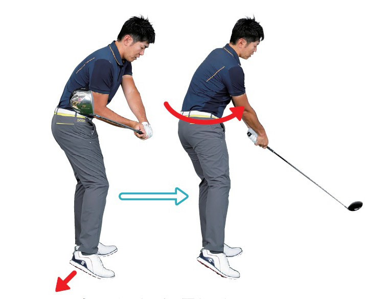 右足を前に踏み出すつもりで体を回るだけ回そう