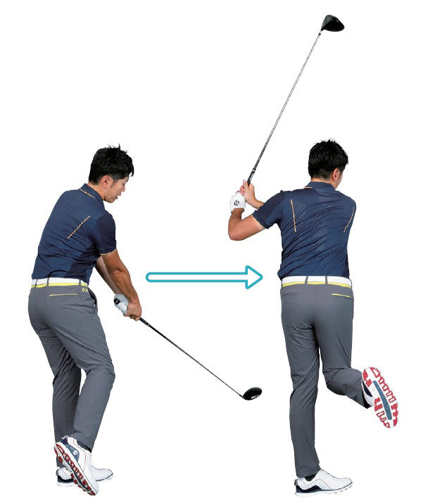 インパクトで左ヒザを曲げて左足を踏ん張ろうとすると腰の回転スピードが上がらず、クラブヘッドも加速しません。右足体重のフィニッシュになりやすい人も参考にしましょう。