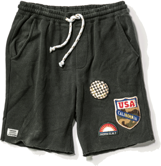 スウェット素材のワッペンアソートを施したショーツ。古き良きアメリカをイメージしたヴィンテージ加工のワッペンが印象的。¥18,000+税