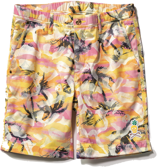 オリジナルカモ柄が映えるショーツ。ロゴ入りボタン、リベットなど細部にもこだわっている。ストレッチ性も抜群。¥42,900+税