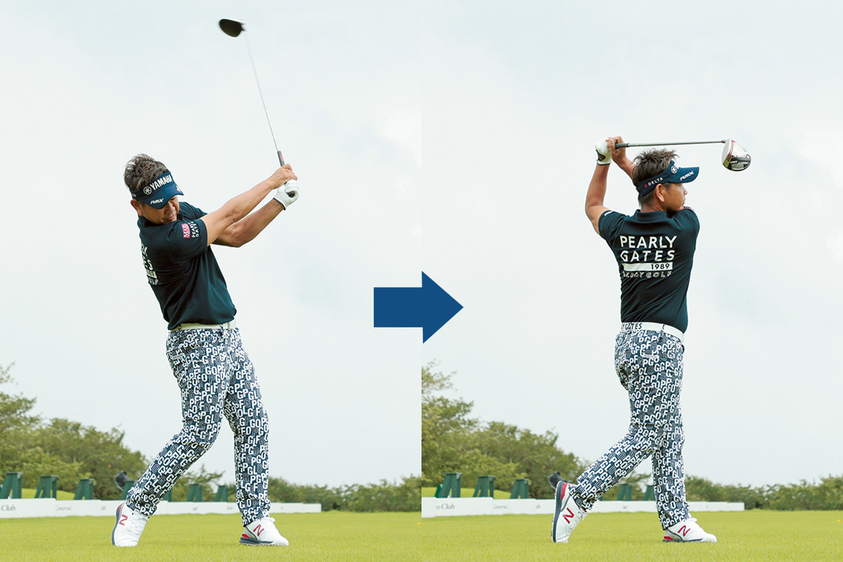 私はクラブヘッドの遠心力を利用することも大切にしています。フォロースルーでクラブヘッドと自分の体が引っ張り合う感覚で、いってみればハンマー投げのようなイメージです。飛ばそうとしてインパクトからフォロースルーにかけて上体が目標側に流れてしまう人が多いのですが、体がクラブヘッドと一緒に動いては遠心力が働かず、パワーが半減してしまいます。かといってクラブヘッドと体が引っ張り合うように頭が目標と反対に動くのもダメ。軸ブレを起こしてスイングの軌道が乱れてしまうからです。