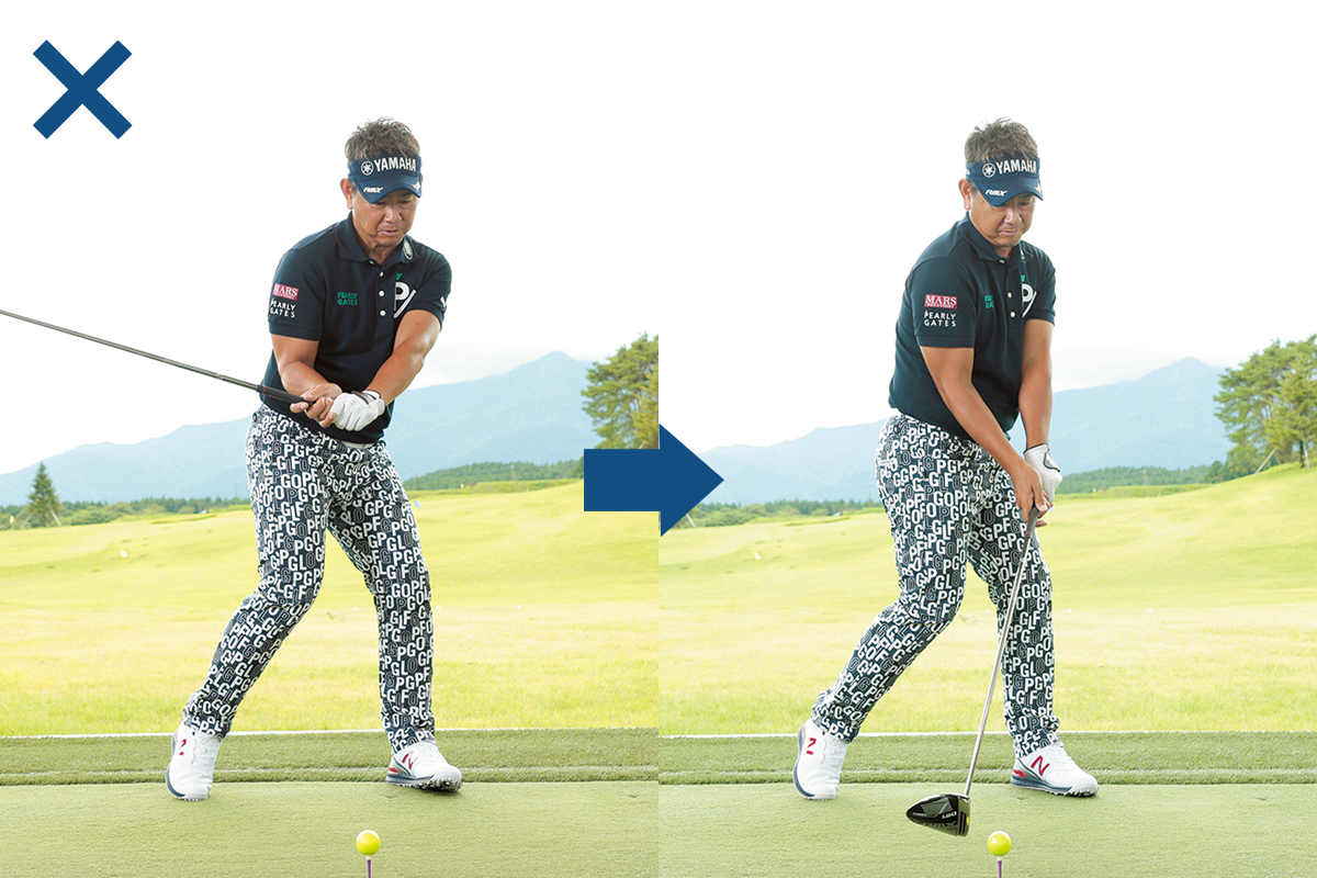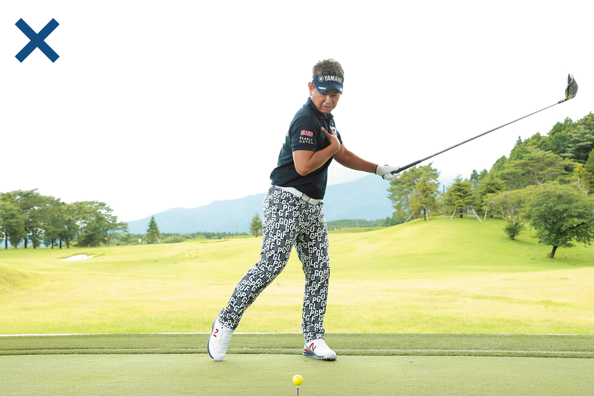 ダウンスイングで右カカトが早く浮くと上体が突っ込みやすい。