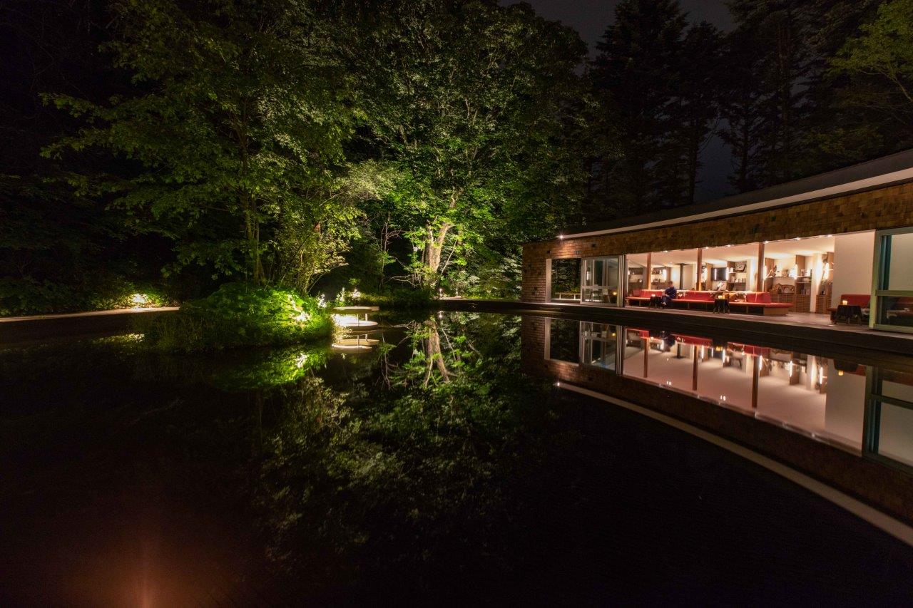 「森のほとりcafe&bar」でリラックスタイム星のや軽井沢の宿泊者だけが利用できる夜20時オープンのバー。森と水辺に囲まれ自然と一体化した空間では、お酒と共に夜のひとときを楽しめる。