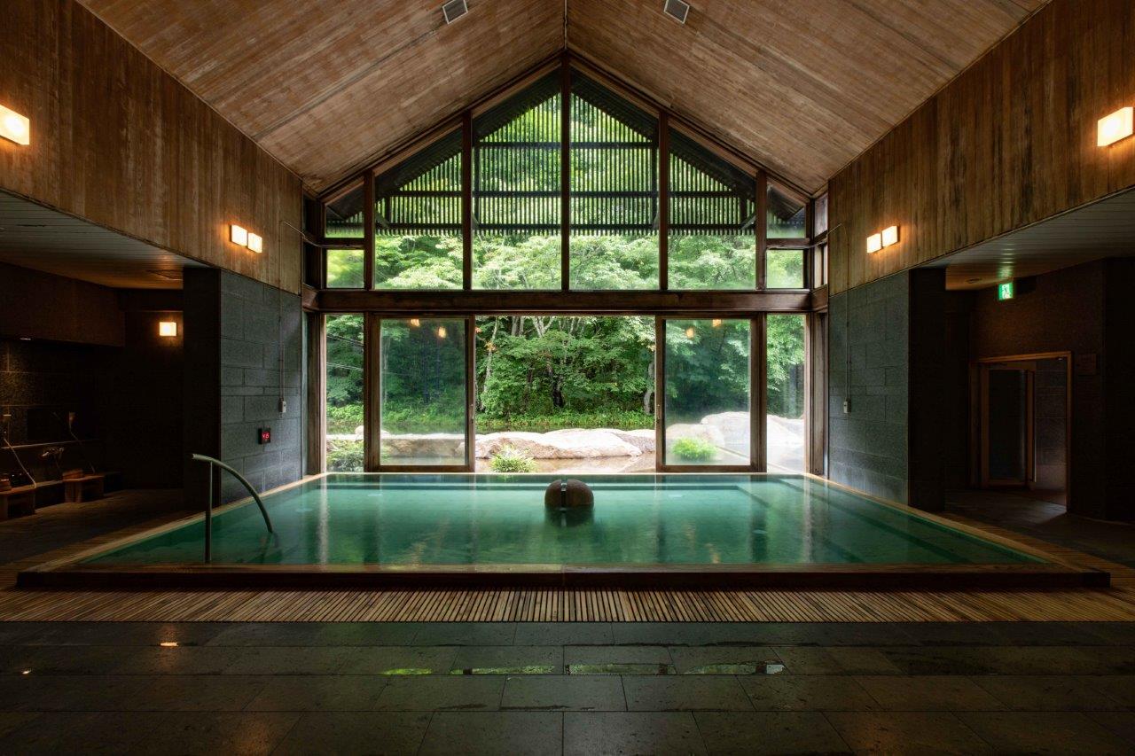 源泉かけ流しの宿泊者専用温泉「メディティションバス」の他、広々内湯と開放的な露店風呂のある「星野温泉とんぼの湯」もあり。朝の宿泊者専用時間にママとキッズは一番風呂へ!