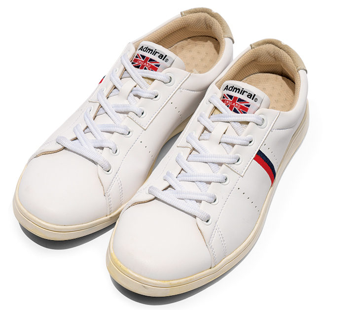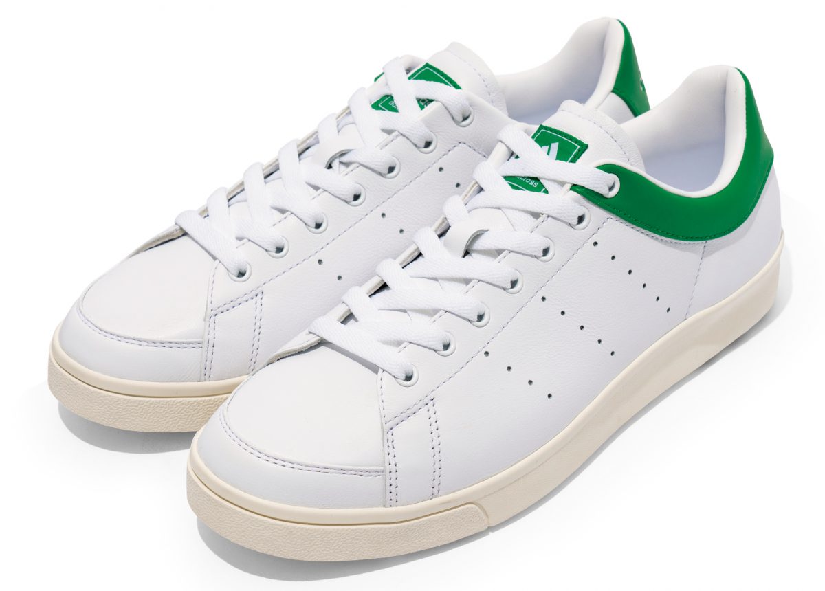 シンプルな白ボディの踵にゴールドを配置。洗練されたデザイン。汚れに強く、コンディションの悪い日でも安心して着用できる。
