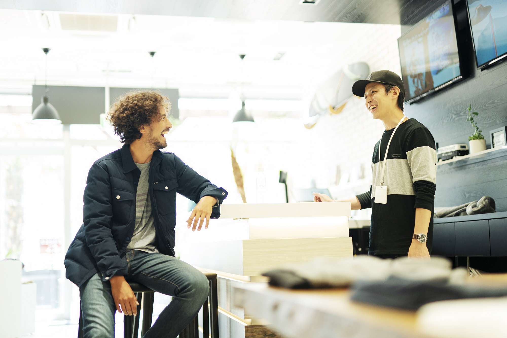 ひとしきり遊んだら、ショッピングの前にカウンターに座って休憩するのがおすすめ。とってもフレンドリーで、ゴルフやサーフィンが大好きなスタッフばかりなので、気軽にコーディネートや着こなしを相談してみてほしい。多彩なラインナップの中から、お気に入りのアイテムが見つけるはずだ。
