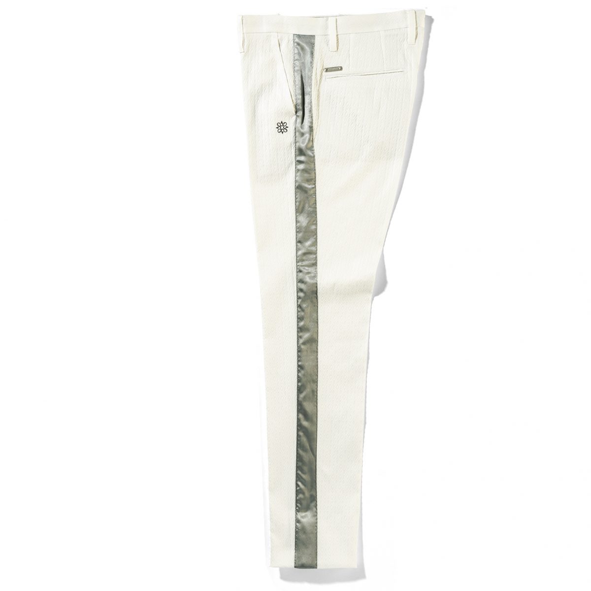 立体的なダイヤ柄が浮かぶストレッチジャカードパンツ。サイドに施したラインデザインがスポーティな印象に。