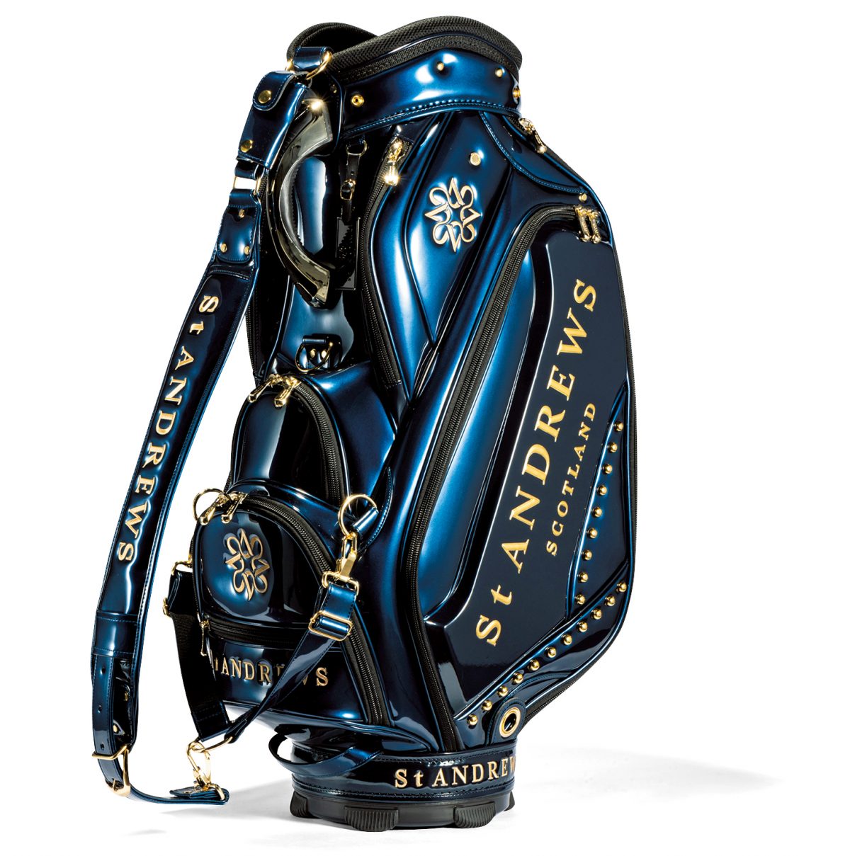 上品な艶めきとスタッズ使いが高級感を演出する定番キャディバッグ。各所に配したブランドロゴの力強いインパクトも魅力。