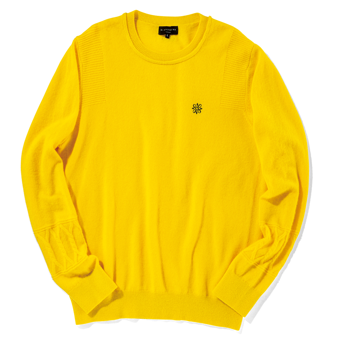 発色の良い鮮やかなイエローが印象的な、上質感の漂うカシミアニットは、肩周りや袖部分の編地の違いで表情に変化を持たせたデザイン。
