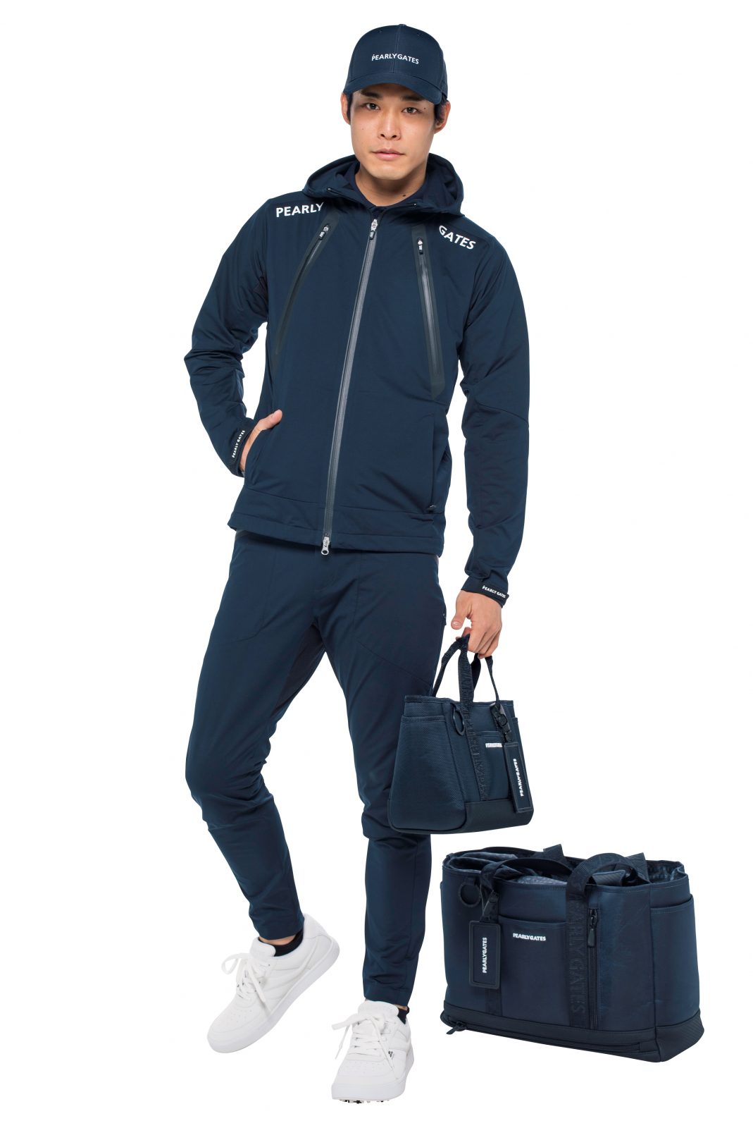 シームレスなジップデザインがポイントになった、アイデンティティーカラーであるネイビーのセットアップコーディネート。ストレッチが効いて動きやすく、シャカシャカ音がしない素材感で、ストレスフリーなプレーが期待できる。