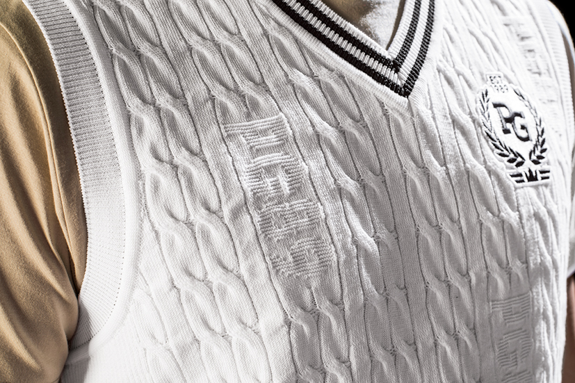 チルデンニットベストのケーブル編み地は、よく見るとPG89のロゴが! 注目されそうな、立体感のある編み込みデザイン。