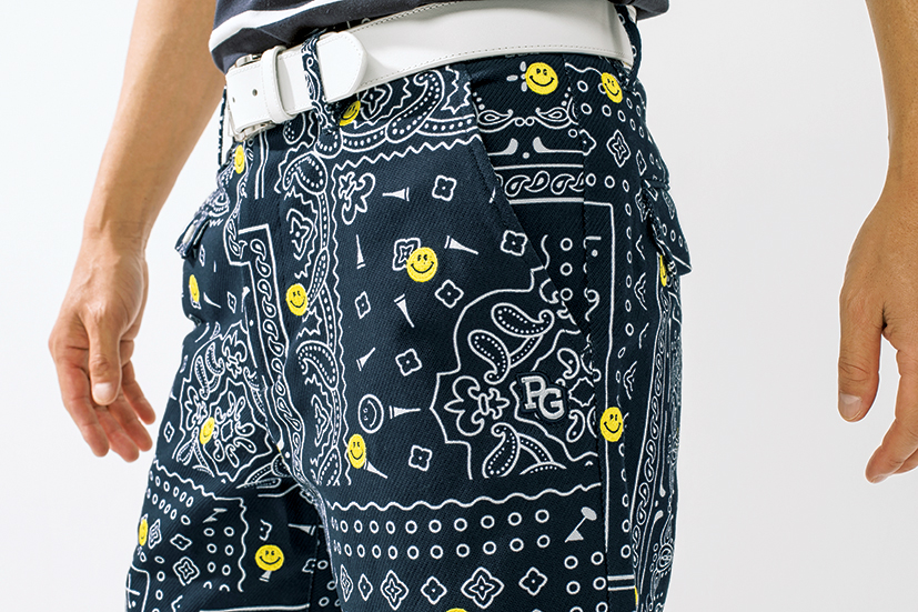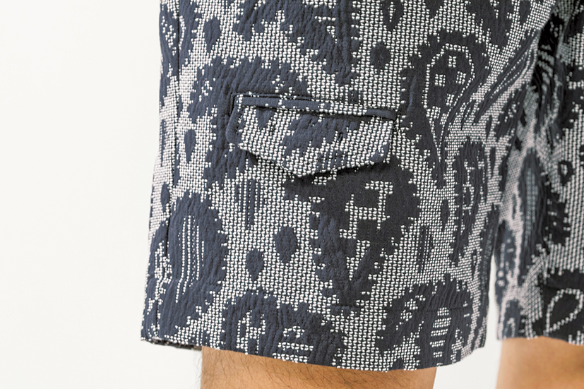 毛羽が少ない素材で生地の表面が綺麗にあがり、光沢がある特徴的なニットとジャガード生地のショーツ、キャップ&シューズまで、独特のペイズリー柄でトータルコーディネート。