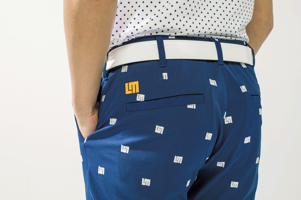 派手な柄プリントに比べ、かなりシンプルな印象の飛び柄刺繍で「LM」ロゴを全面に配置。派手すぎず動きやすさも抜群なパンツ。