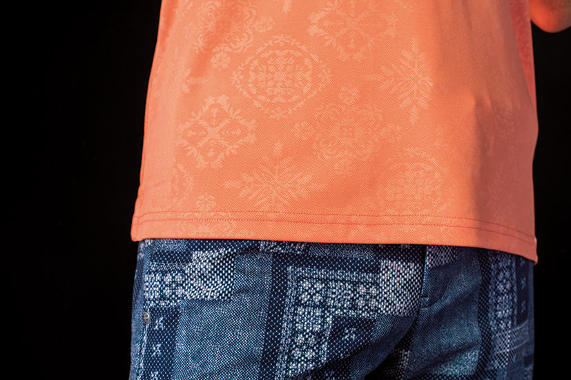 鮮やかなコーラルオレンジ色のシャツは、エンボス加工されたスペインタイル柄をモチーフに。無地見えするので、柄ボトムにも合わせやすい。