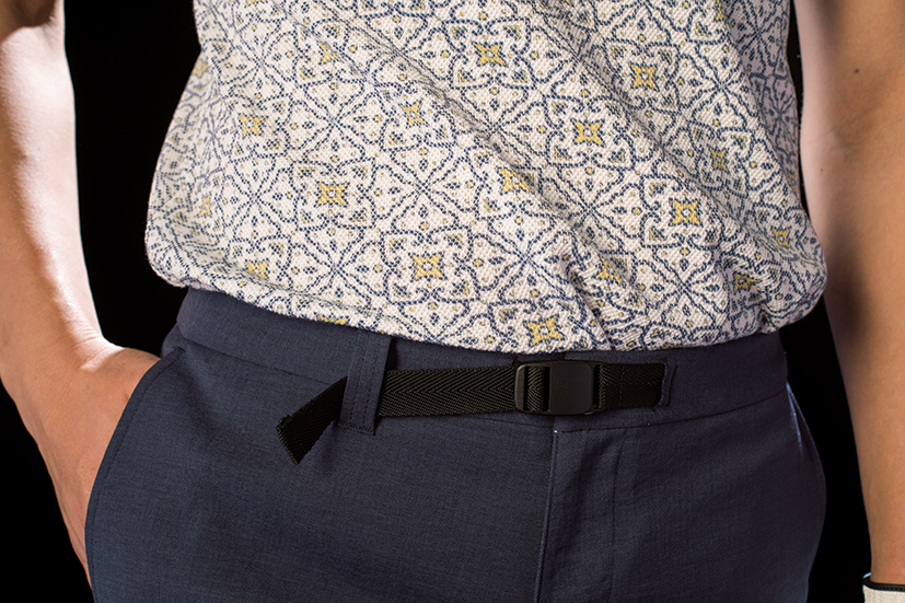 ネイビーのリネンライクストレッチパンツは、ベルトのディテールにこだわりあり。ベルトなしでサマになる、便利なデザイン性が優秀。