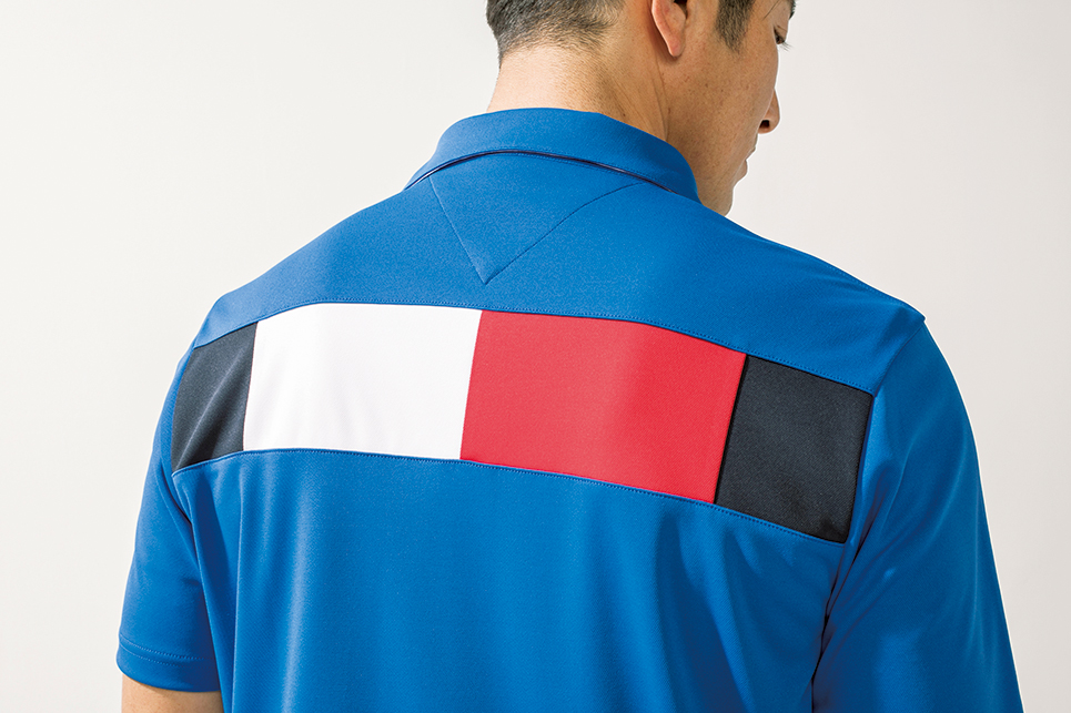 セーリング・マリンをテーマにした爽やかなカラーのポロシャツは、背中部分のブランドカラーの切り替えがアクセント。