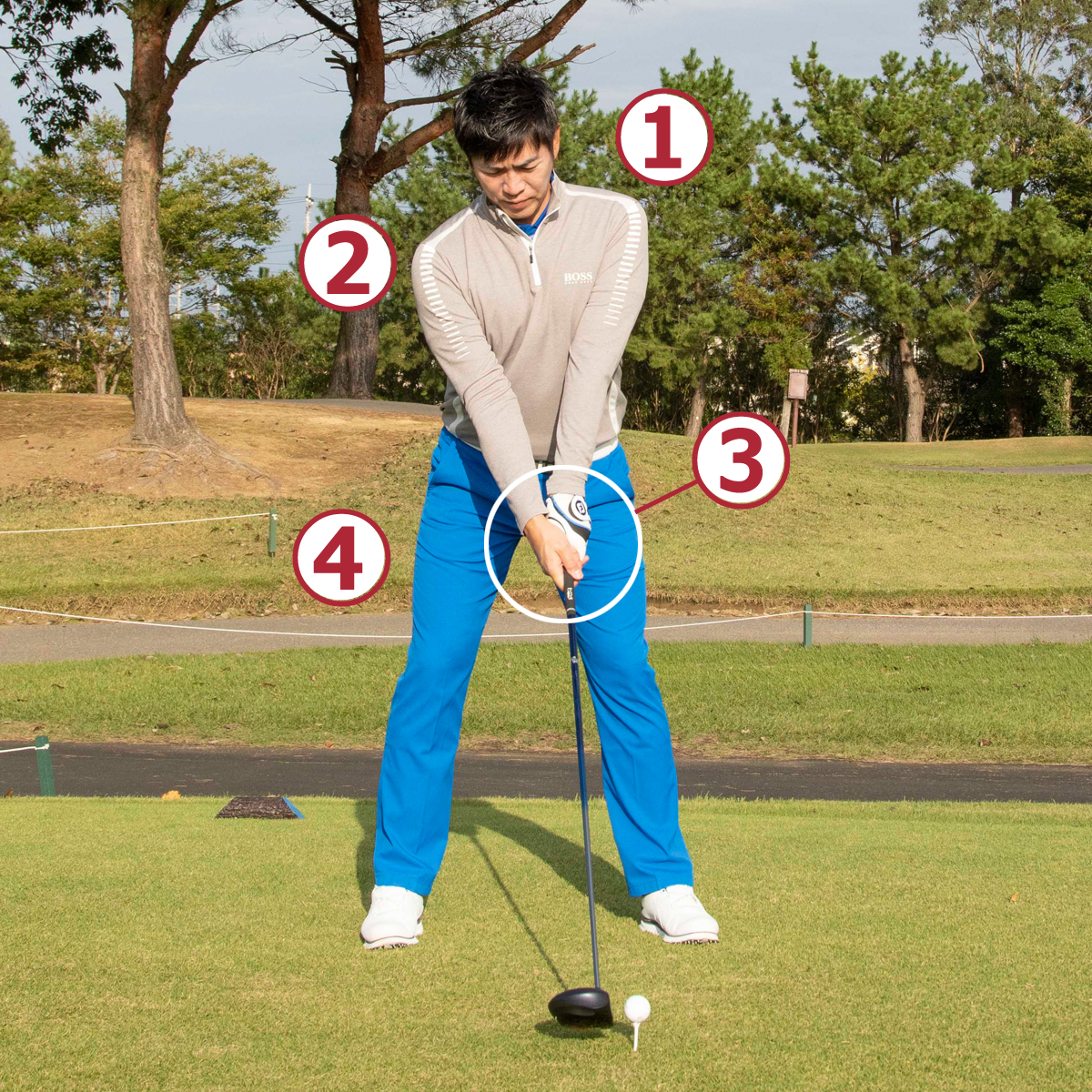 腕や肩に力が入っていると、スムーズに体を回すことができず、正しい軌道でクラブを振れなくなってしまいます。リラックスして、両ヒジが外を向かないように注意して構えましょう。