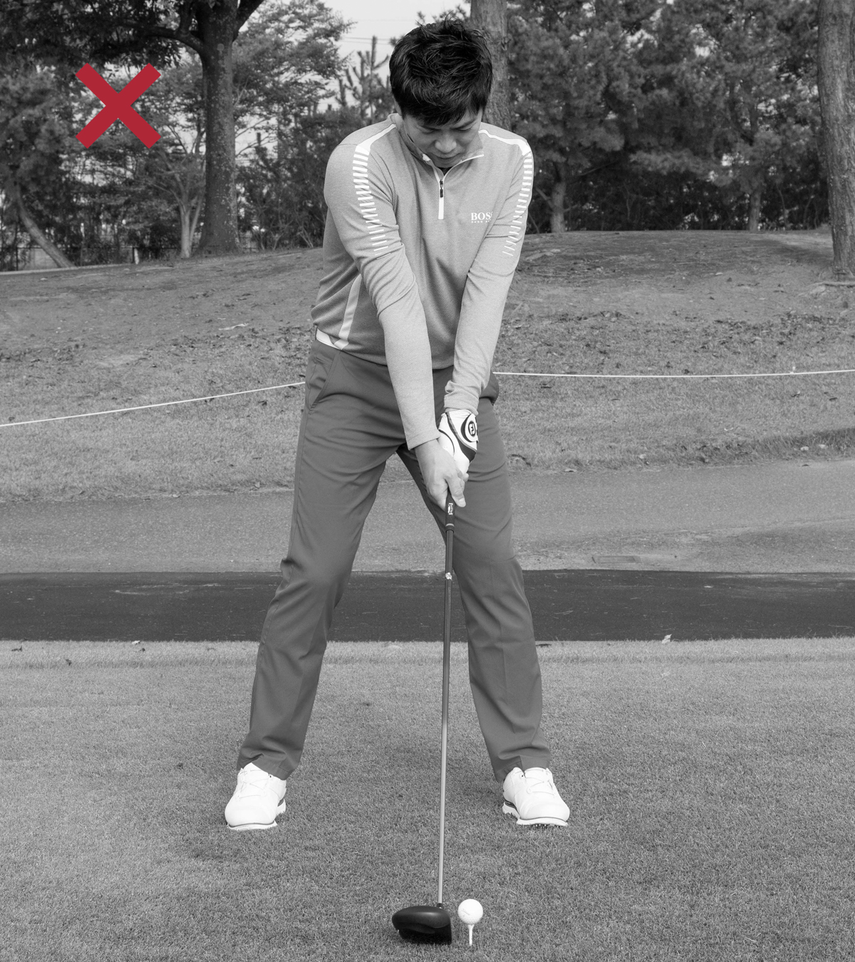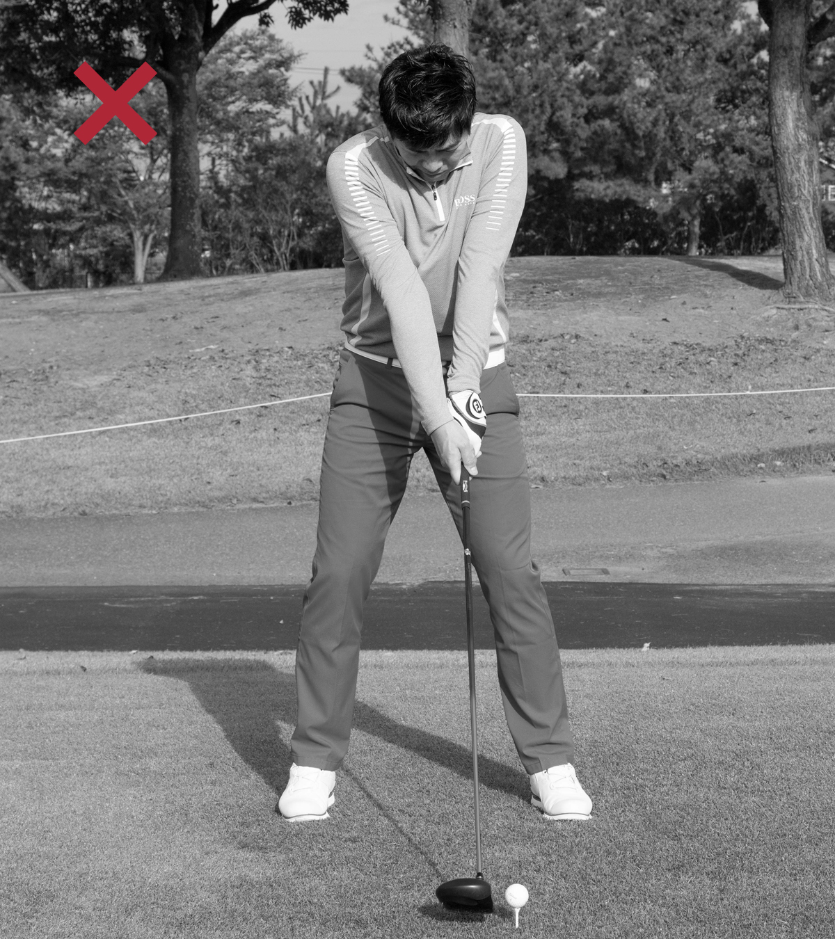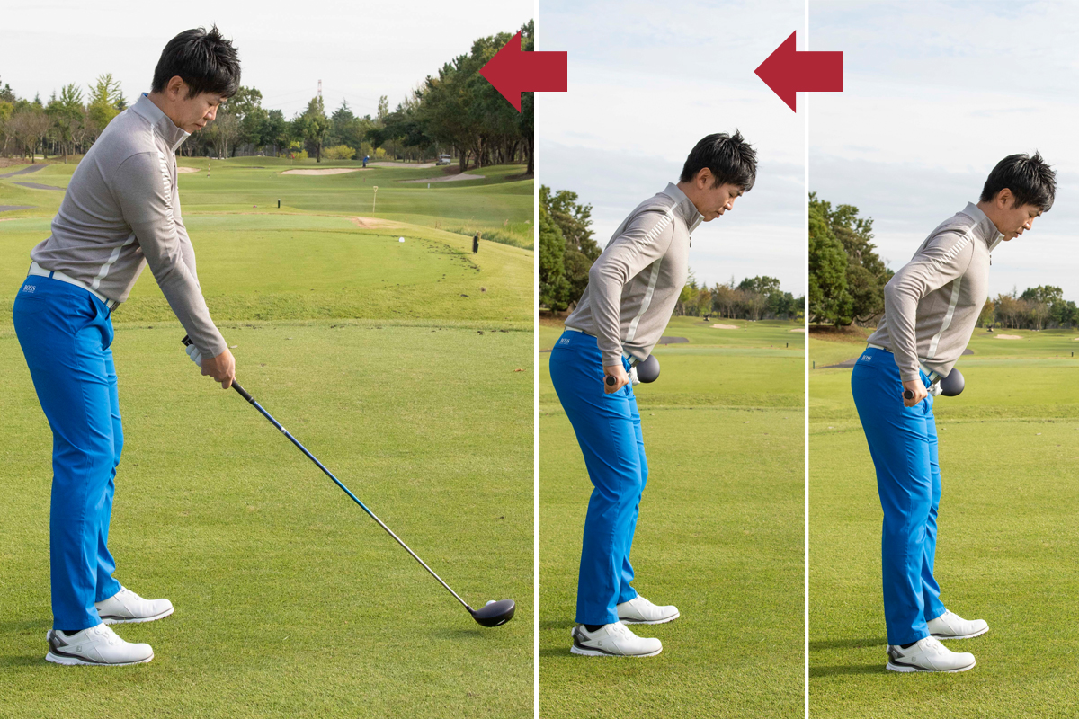 自分では前傾しているつもりでも、お尻が後ろに落ちた後傾のアドレスになっている人は多い。いきなりヒザを曲げて構えようとすると、お尻が落ちやすいので注意しましょう。
