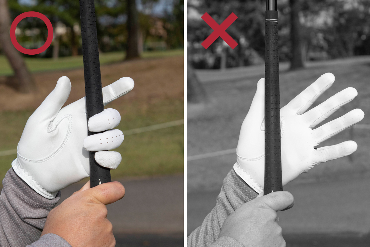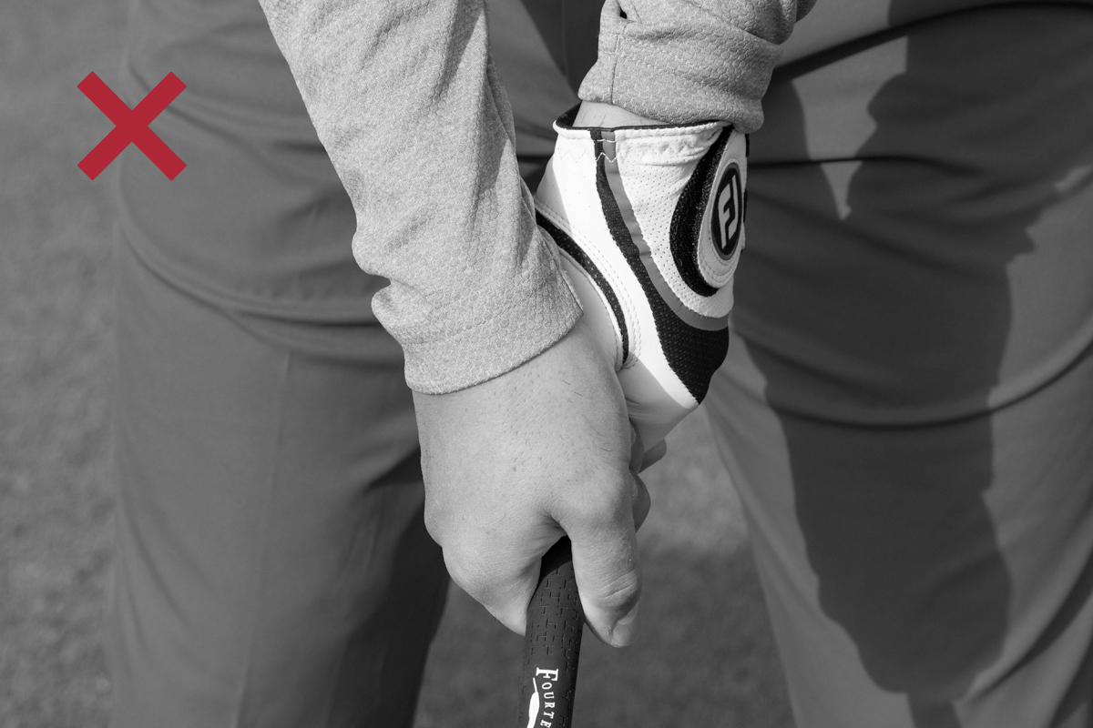 クラブを手の平で握りしめるようにグリップするのはNG。指のつけ根に引っかけるように握るのが正解です。