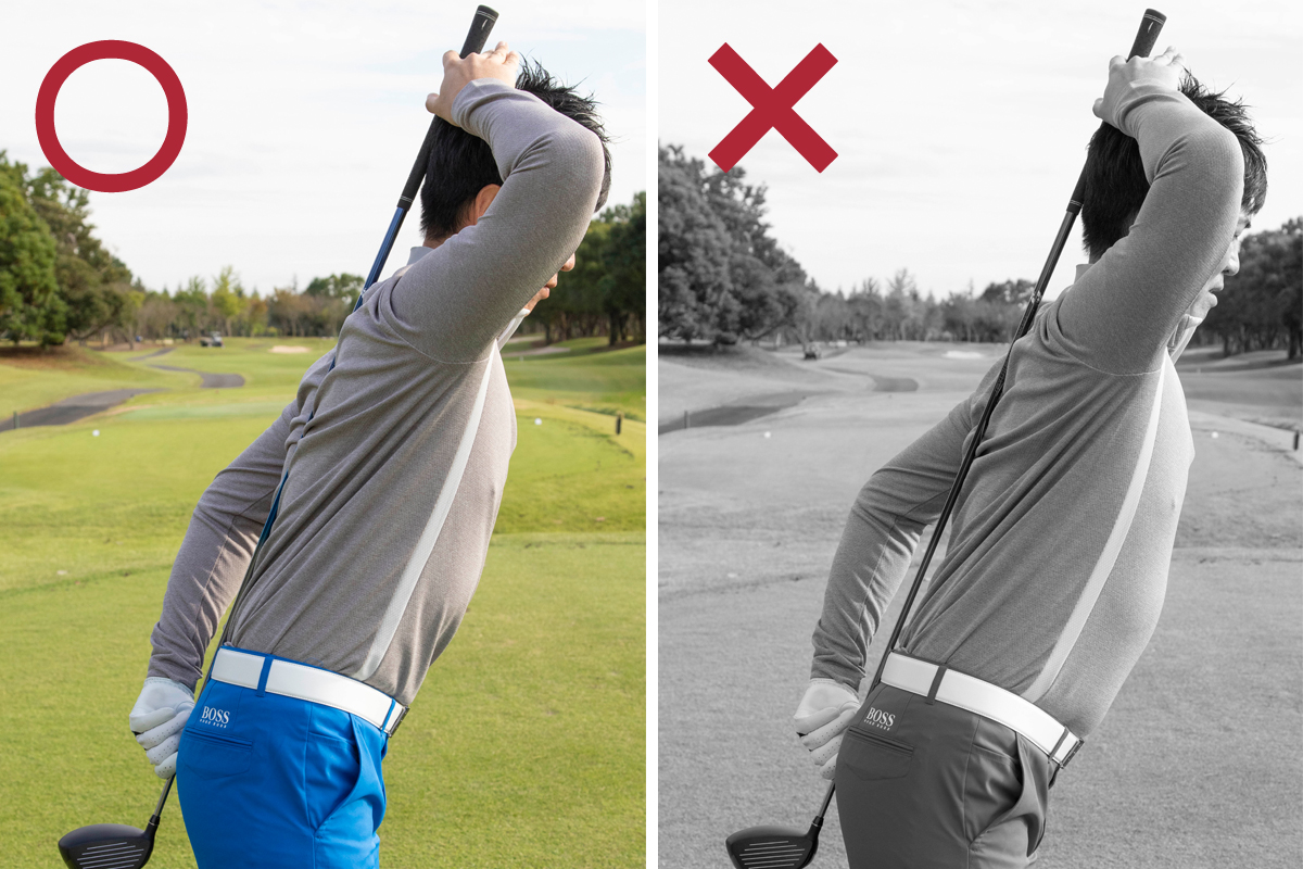 (×)前傾した時に反り腰になると、クラブを背中に当てた時に隙間ができてしまいます。