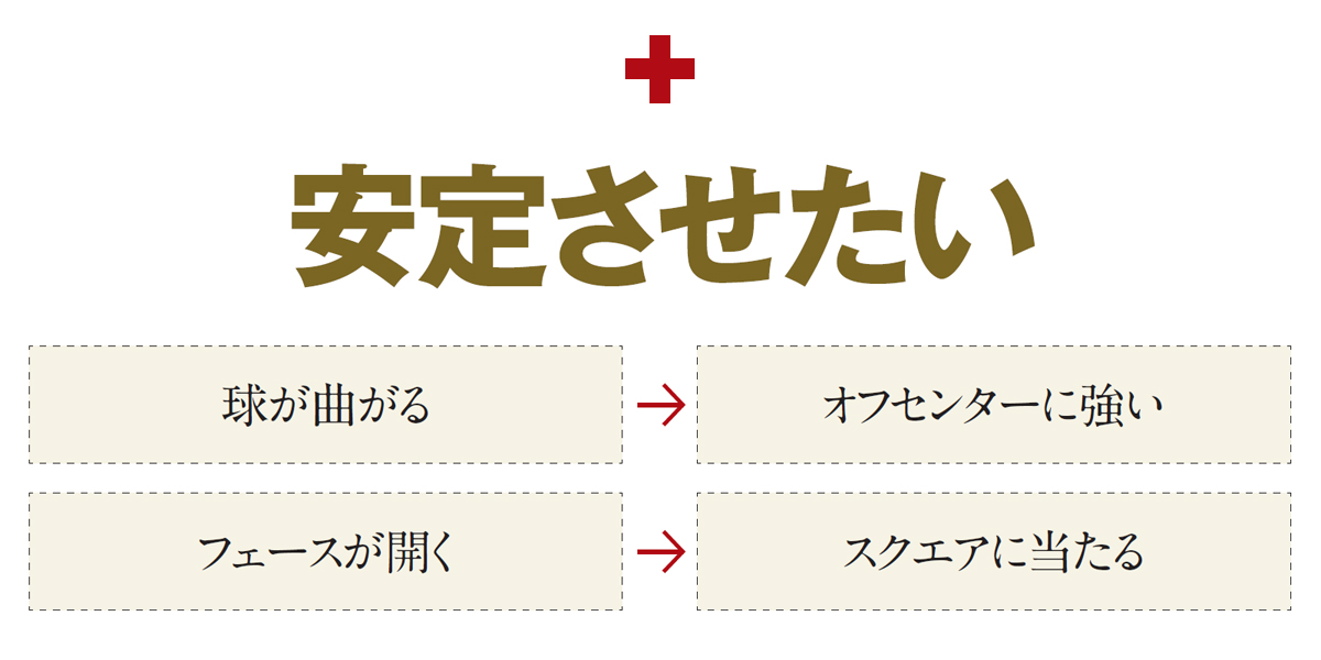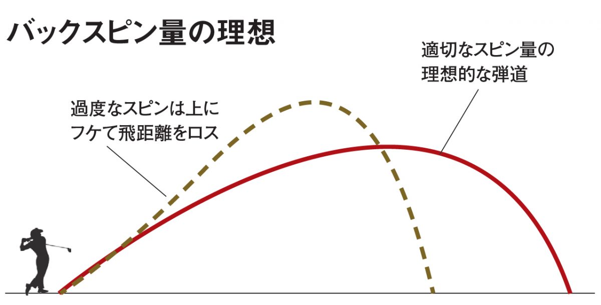 飛ばしの3つの初期条件のひとつで、バックスピン量が少ないと曲がり幅が抑えられる反面、ボールに揚力が生まれず球が上がりにくく、また逆に多すぎると前に飛ばないため、適切なスピン量になるヘッドを探したい。