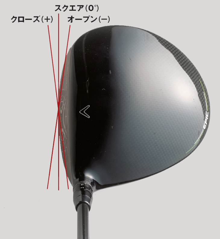 フェース向きを角度で示したもの。右向きのオープンなら球が右に逃げやすく、左向きのクローズドなら球がつかまりやすい。市販モデルの多くはスクエアな0°だが、マスキングなどデザインによっても見え方は変わる。