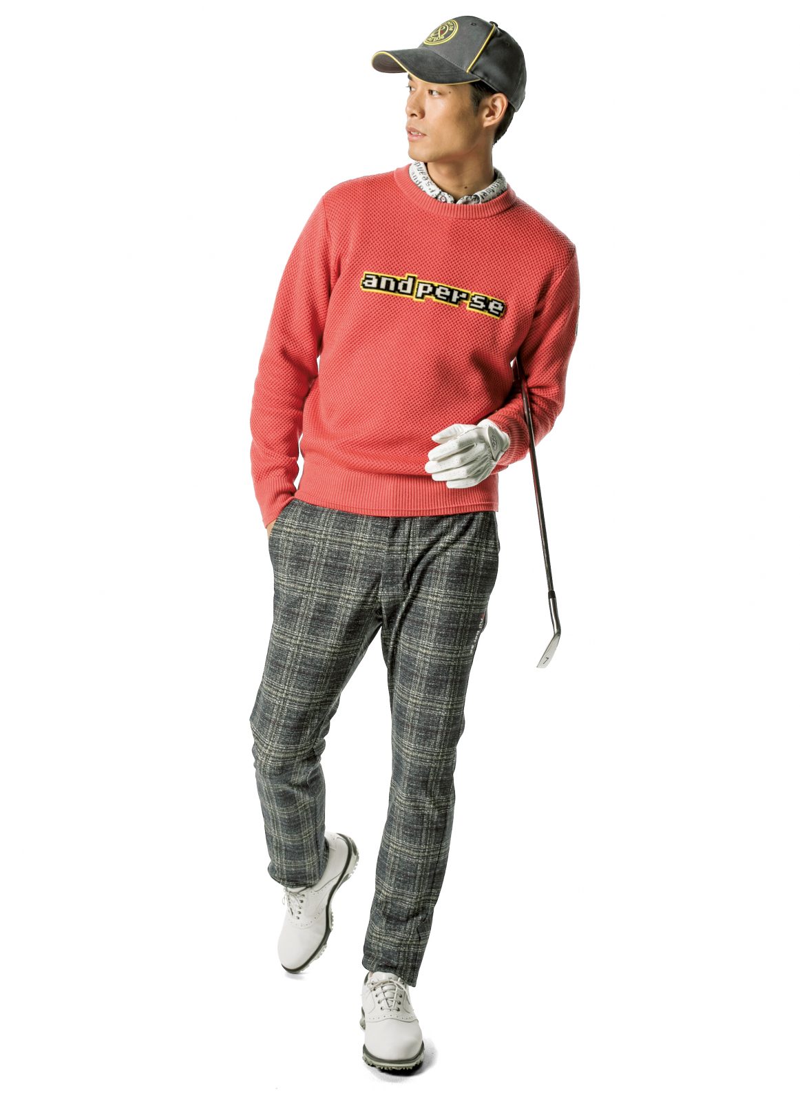 デザイン性の高いニットに合わせるのは、こなれた大人ゴルファーのクラス感漂うチェックパンツ。ニットに配したロゴのイエローをキャップで拾って統一感のあるコーデに。