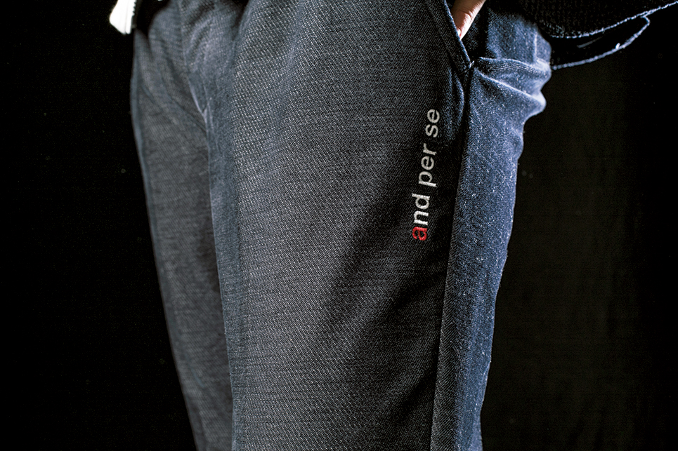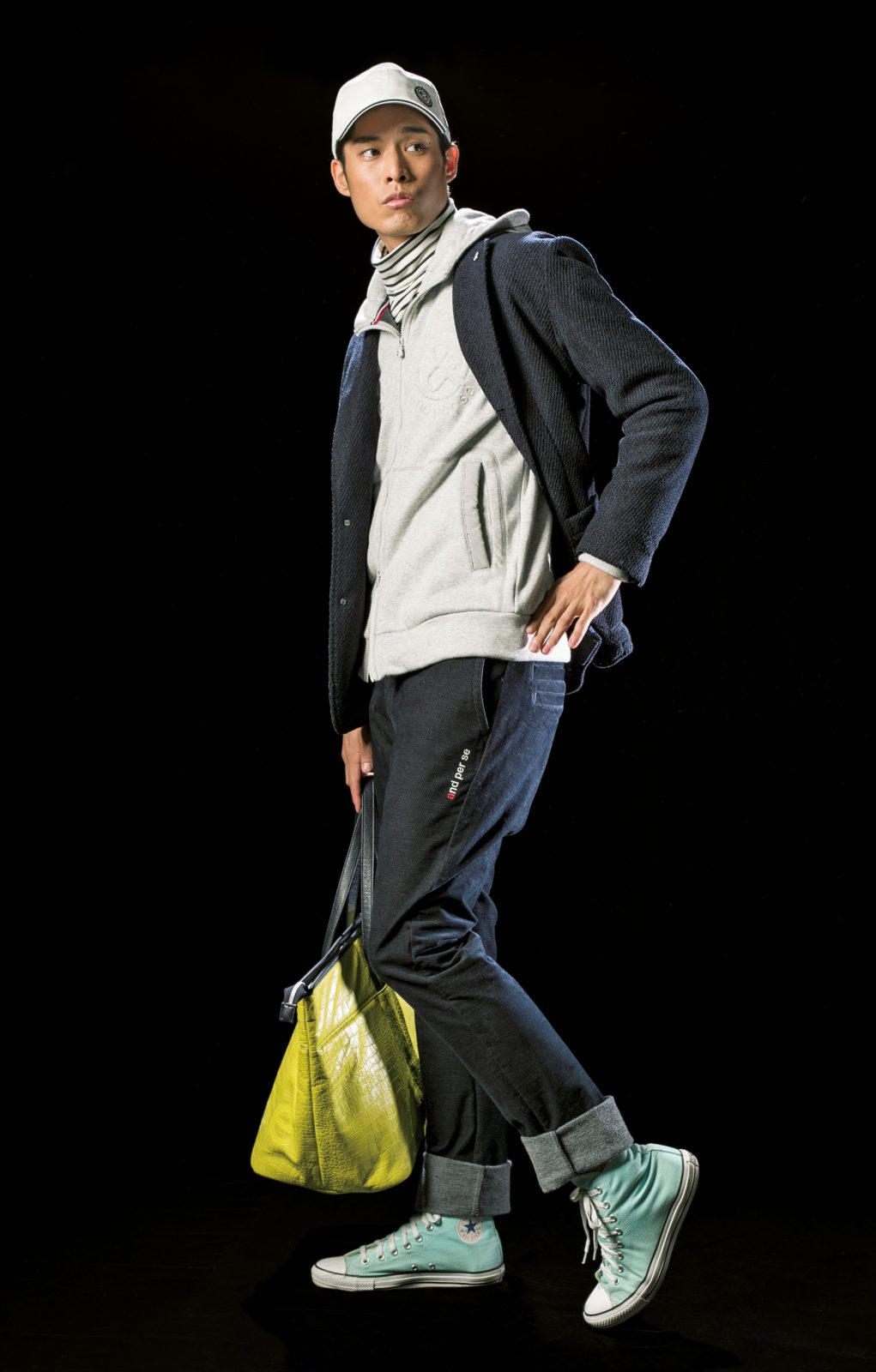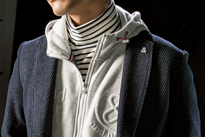 中村:表情のある上質ジャケットにパーカやジーンズ生地に見える素材のパンツで少し遊んで、あえてカジュアル感を楽しんだコーディネートです。パンツのロールアップ×ハイカットシューズもポイントです。