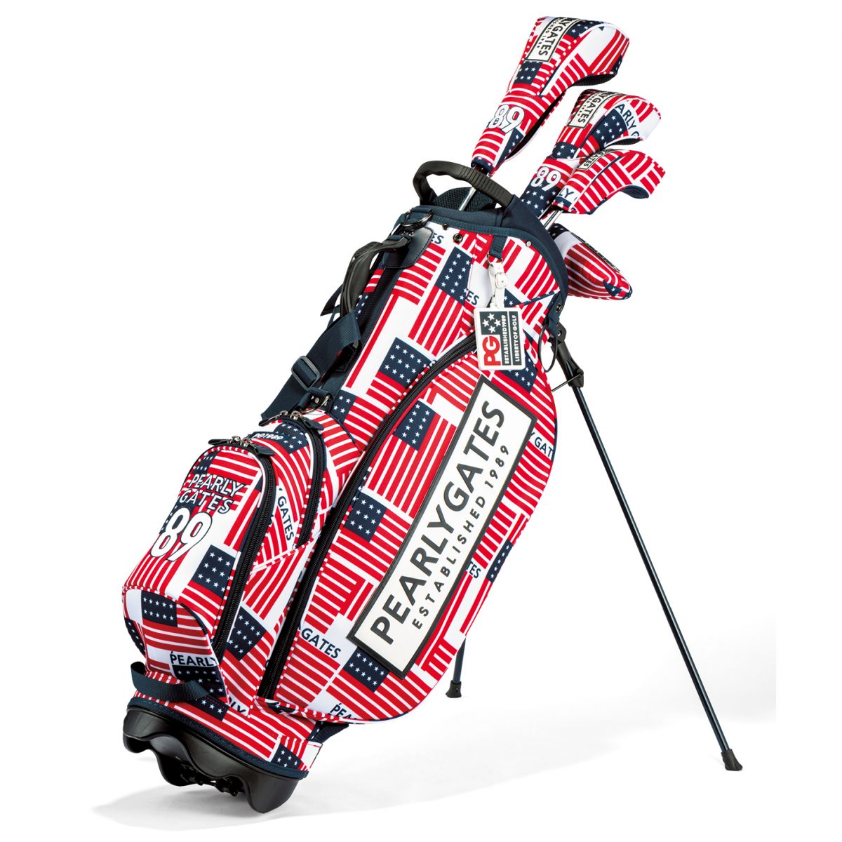 アメリカーノスタイルの世界観を高める同柄ヘッドカバーとセットで使用したいオリジナル星条旗モチーフのキャディバッグ。