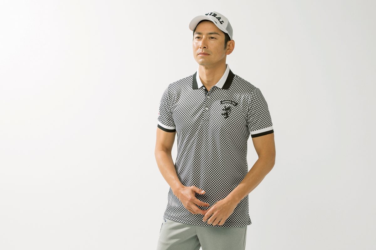 グランプリチェック柄をプリントで表現したポロシャツは、襟や袖リブの配色もポイント。吸水速乾、UVカット機能付き。