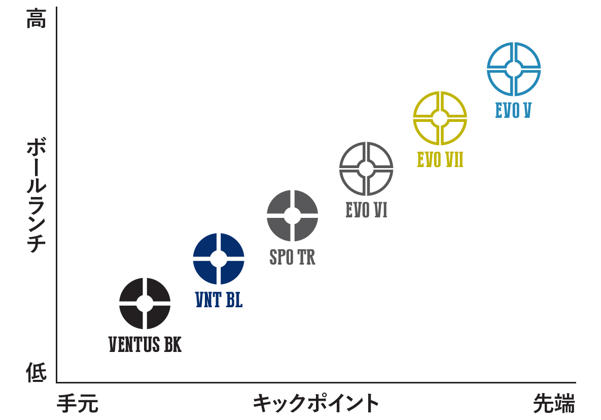 他のフジクラ製品とVENTUSの弾道高さとキックポイントの図。ブラックは最も手元寄りで打ち出しが低い。