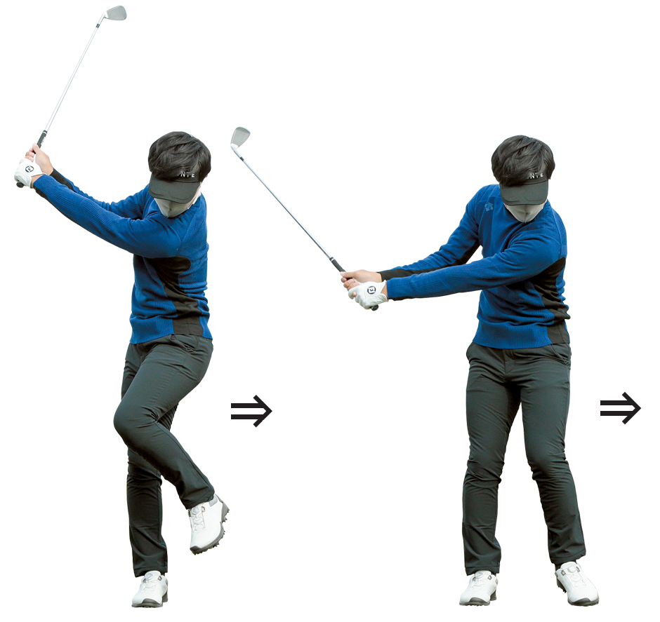 下半身の力を効率良くクラブに伝えるためには、足を踏み込むタイミングが重要になってきます。下半身を先行させて、後から腕、クラブの順番で動くのが正解です。この感覚をつかむために、足踏みをしながら連続素振りで練習しましょう。