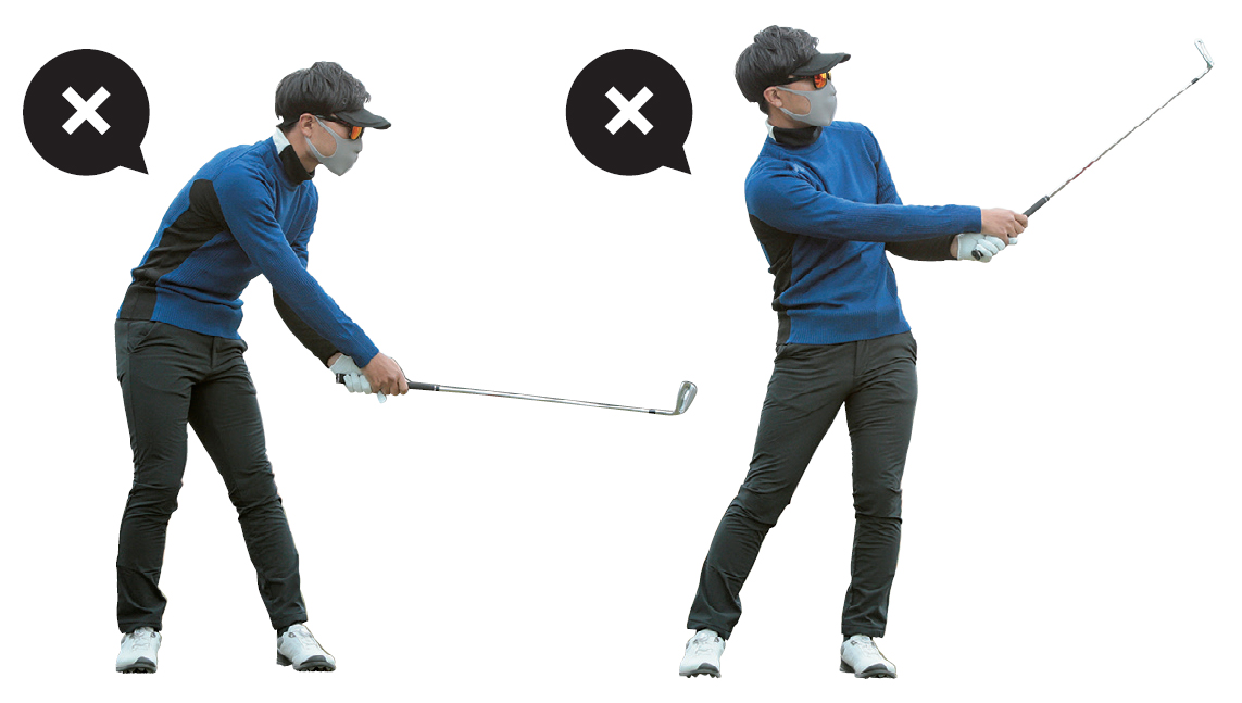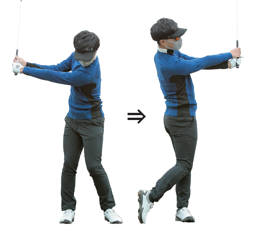腰から腰のスイングで体の動きを確認したら、次は肩から肩のスイング、その次にフルスイング、と徐々に振り幅を大きくしていく。