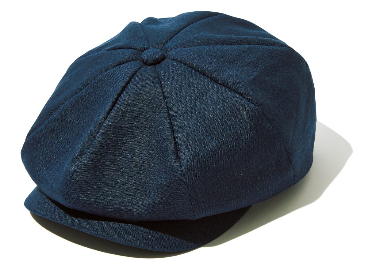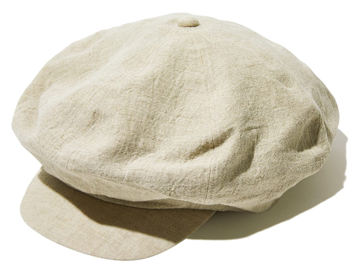8枚ハギで被りやすいキャスケット。大ぶりなシルエットで男らしさを演出してくれる。程よいシワ感と糸ムラがこなれた雰囲気を醸す。13,750円