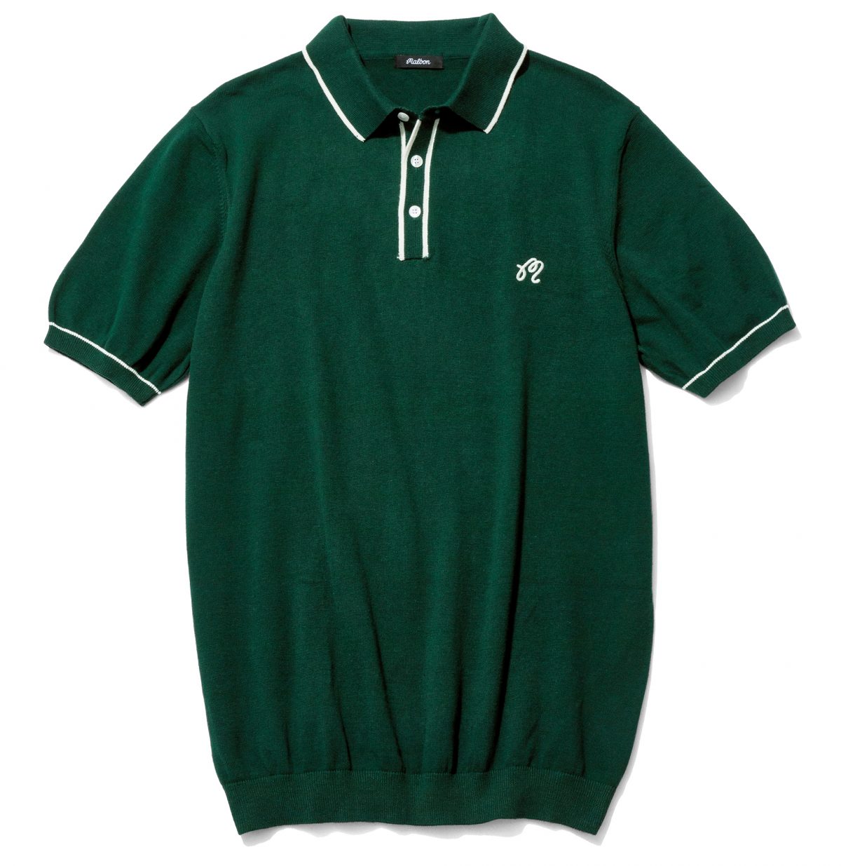 前立てのラインやコントラストトリム、左胸の「M」スクリプト刺繍が、上品な雰囲気をまとったニットポロシャツ。