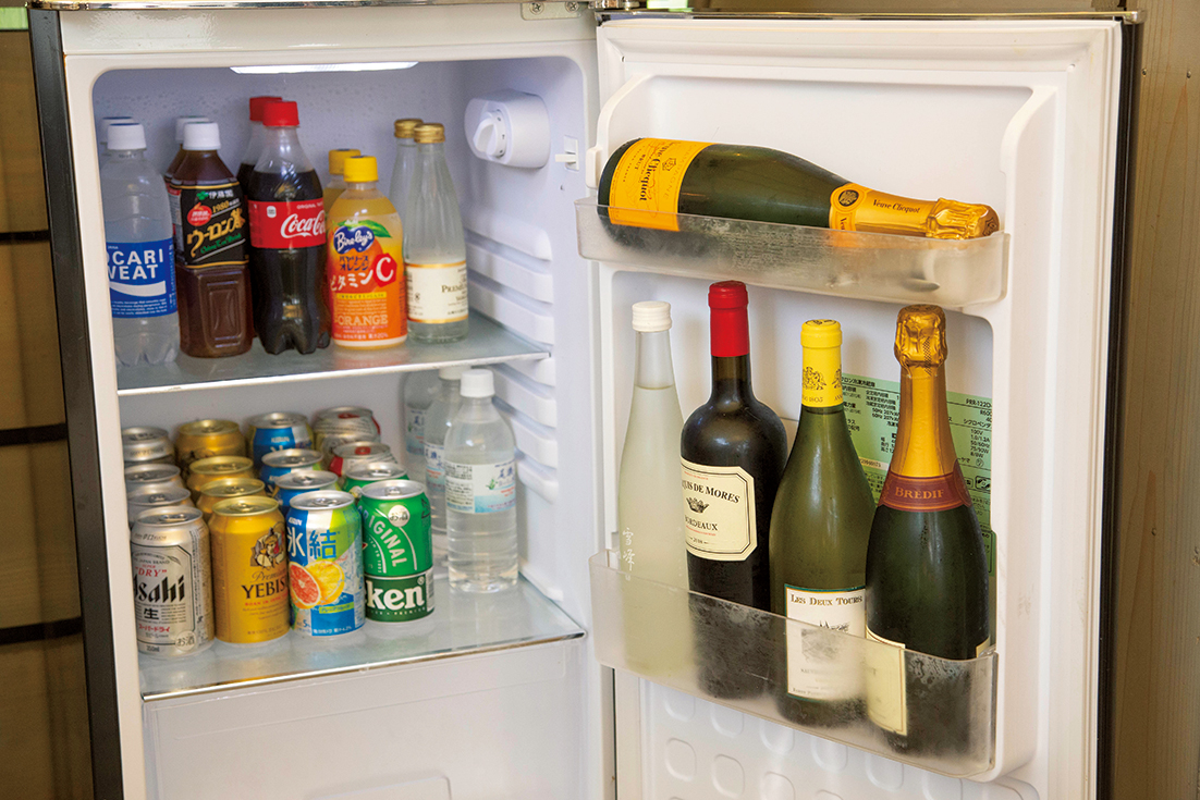 アウトドアリビングの冷蔵庫にアルコールからソフトドリンクまで用意されているので、買い出しの必要はなし。