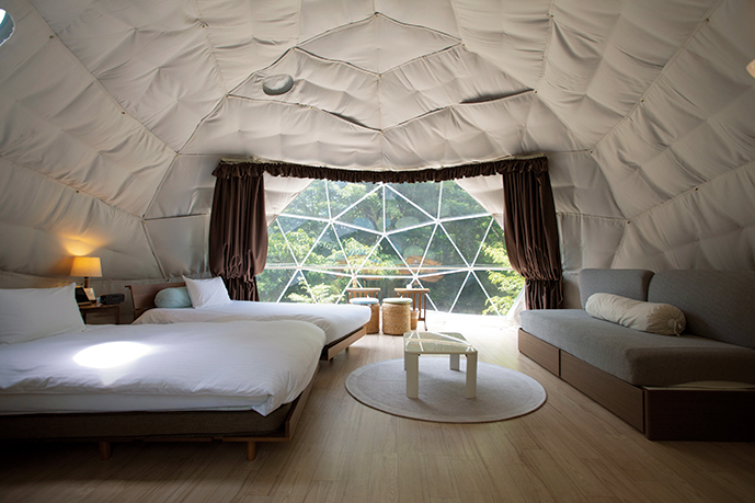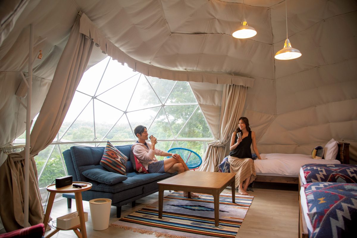 ドーム型のキャビンを10棟備え、手軽にアウトドアが楽しめる。車で20分ほどの距離にある紫塚ゴルフ倶楽部でのラウンドとセットで楽しむ利用者が多い。