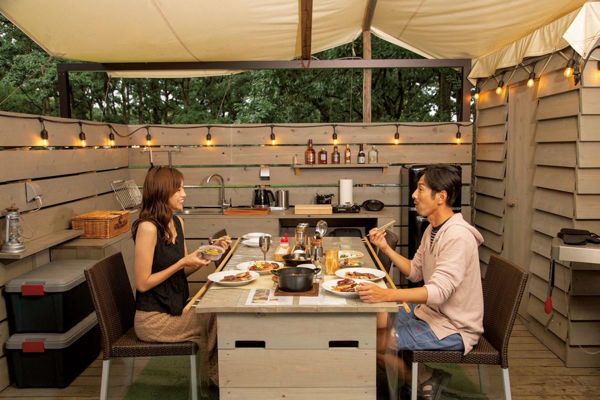 キャンプ用品や食材などがあらかじめ用意されており、手ぶらで豪華な宿泊を楽しめるグランピング。気軽に利用できるので、アウトドアが苦手な人にもおすすめ。冷暖房を完備している場合も多いので、寝苦しいこの時期の夜も快適に過ごせる。