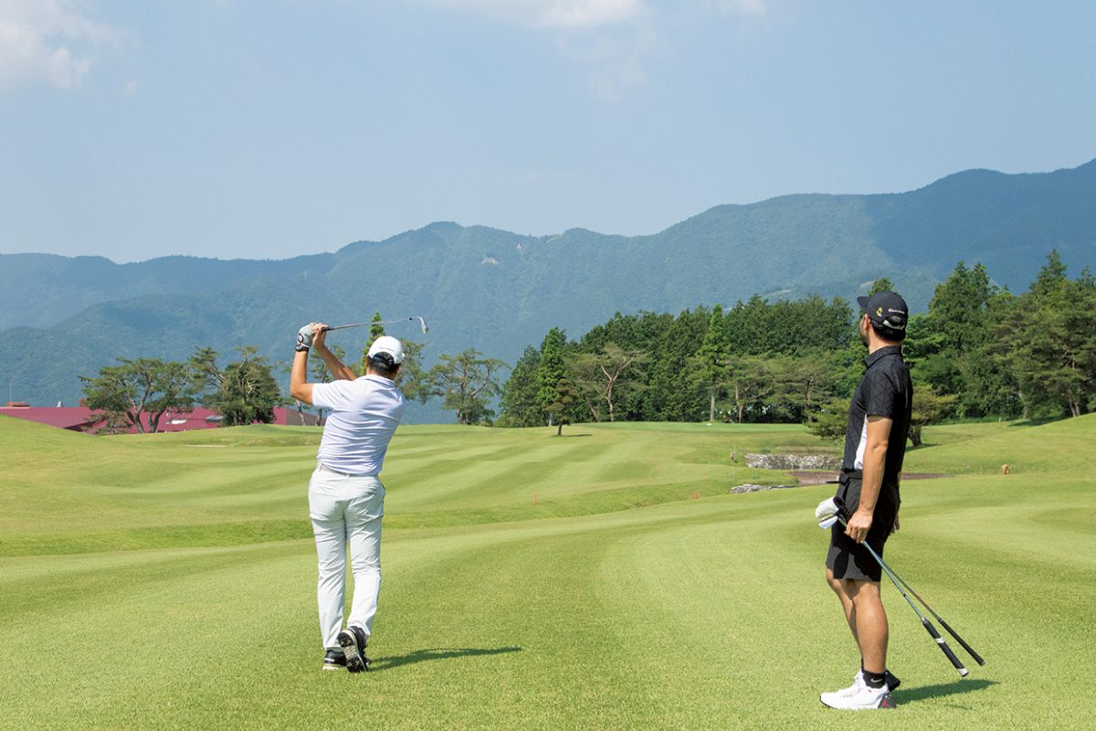 グランピングで自然に癒やされた翌日は、随所に池や滝を配した造園のコントラストが美しい紫塚ゴルフ倶楽部でラウンド。250ヤードのドライビングレンジ、朝食ビュッフェも楽しめるレストラン、掛け流しの天然温泉と設備も充実しており、前日からのリゾート気分を保ったまま、気持ち良くプレーできる。