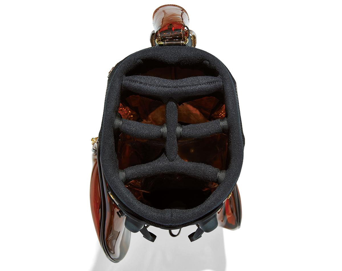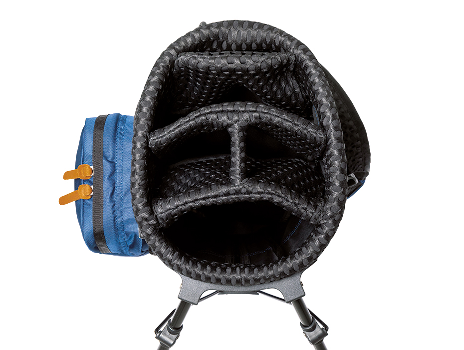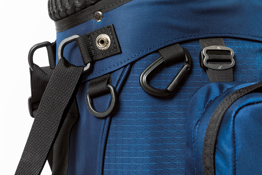 現行のデイパックと同デザインのブランドタグを各所に配置。デイパックにも使われる耐摩耗性に優れるナイロン素材をキャディバッグにも使用する。